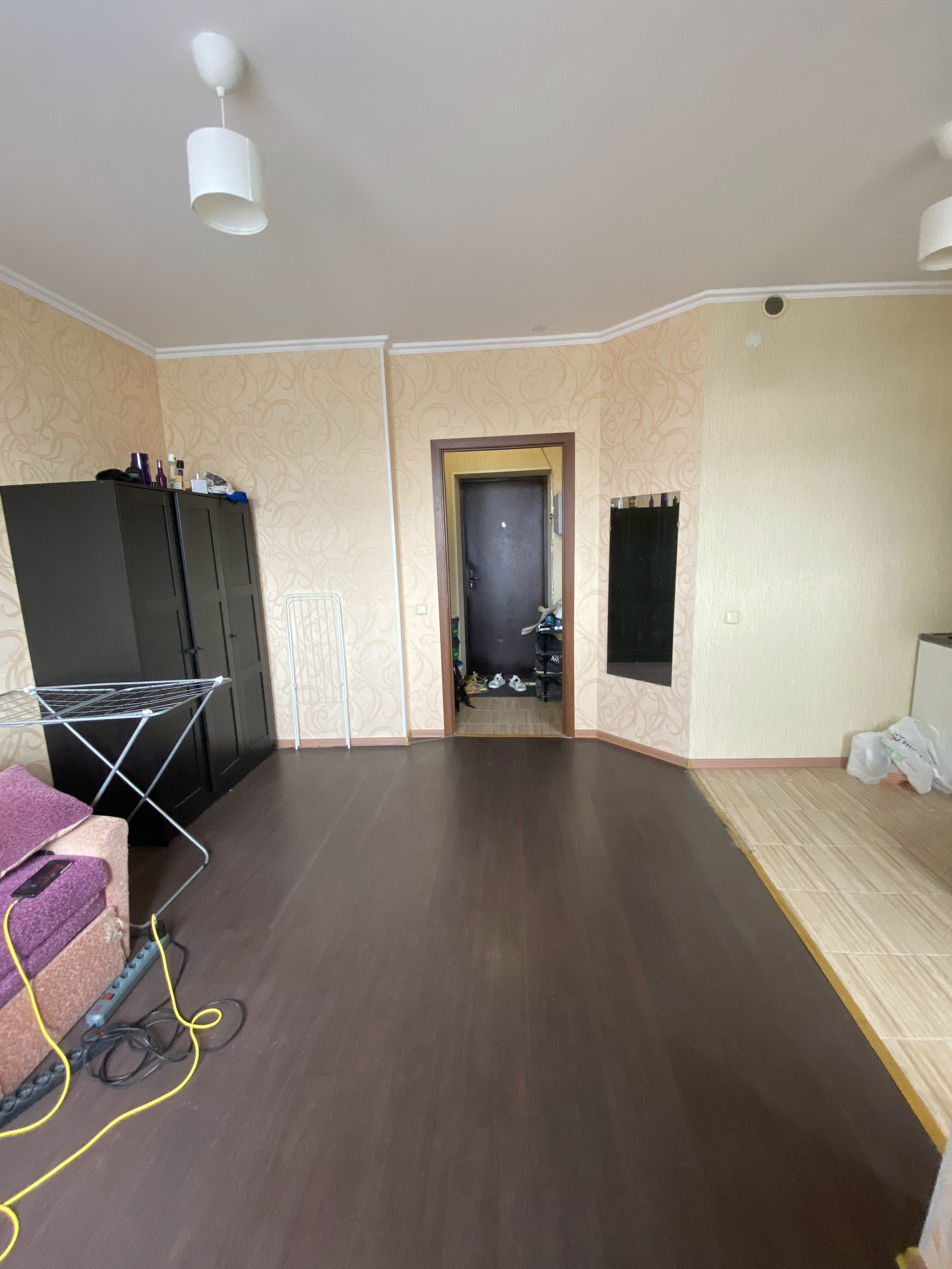 Солнечная студия. Такая планировка всего одна на этаже, зонирование кухонной зоны от гостевой, в коридоре есть место для небольшой гардеробной, просторный санузел. Квартиру покупали с отделкой от застройщика.