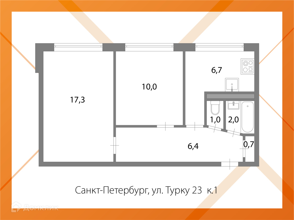 Кухня – 6,7 кв.м., комнаты – 10 + 17,3 кв.м. В квартире выполнен ремонт, раздельный с/у в кафеле.