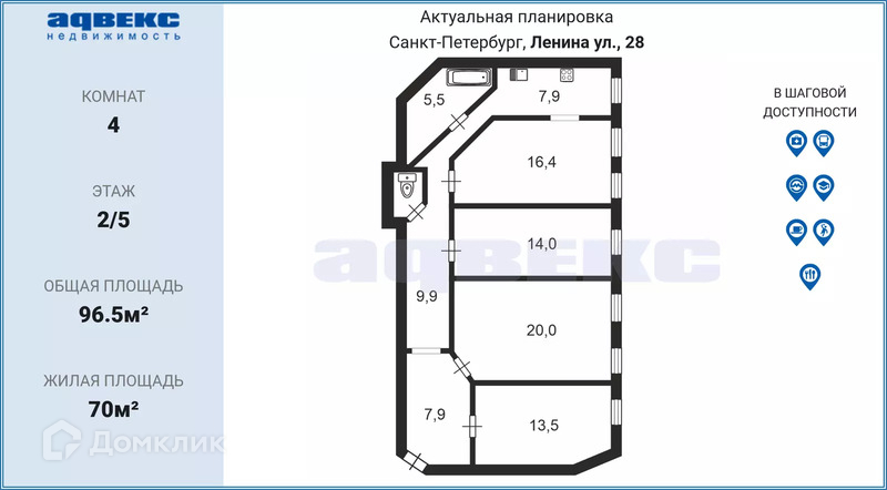 4-комнатная квартира, 96.5 м2, этаж 2 / 5, на продажу в Санкт-Петербурге, улица Ленина, 28