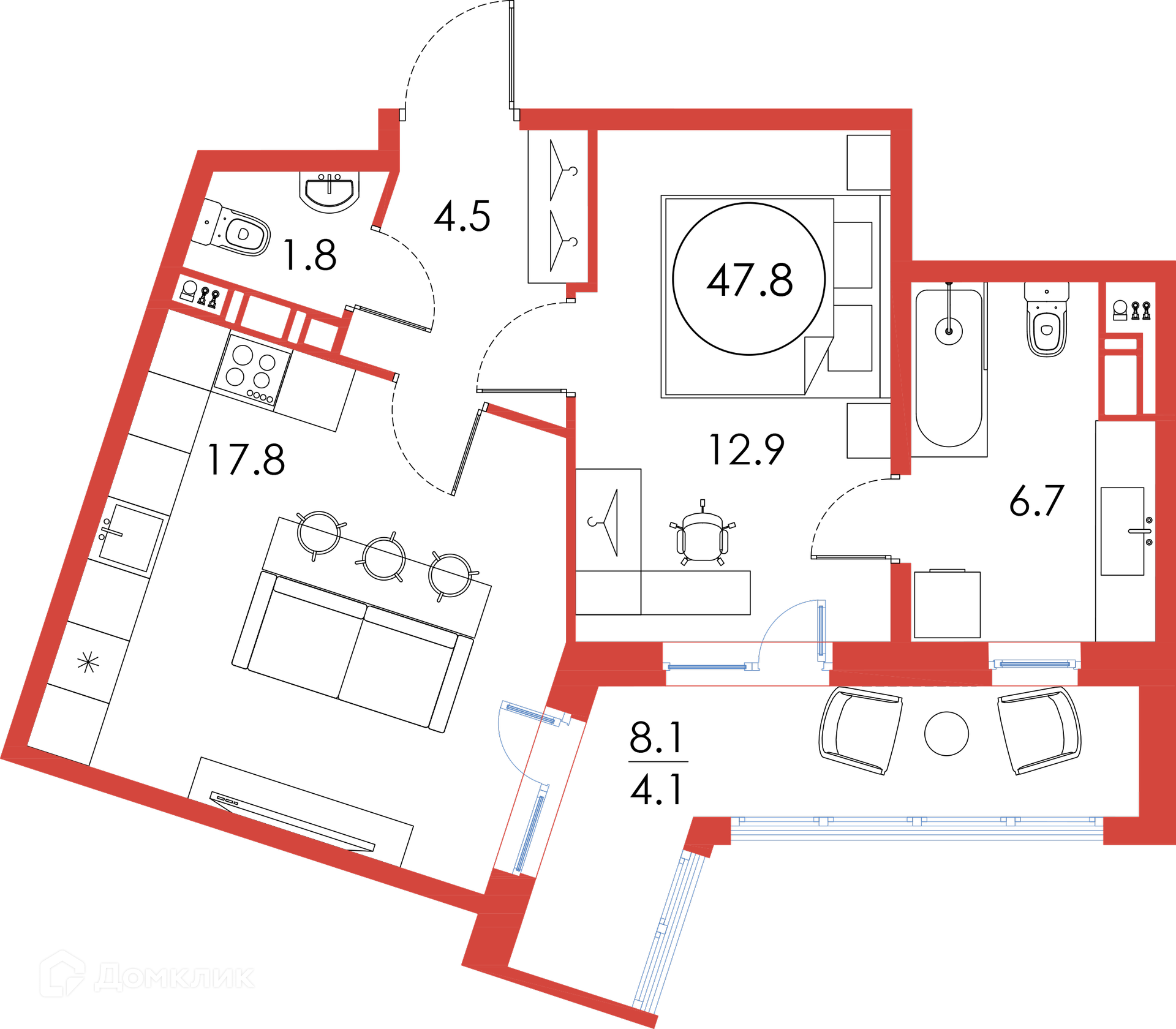 Общая площадь 47.8 м2
