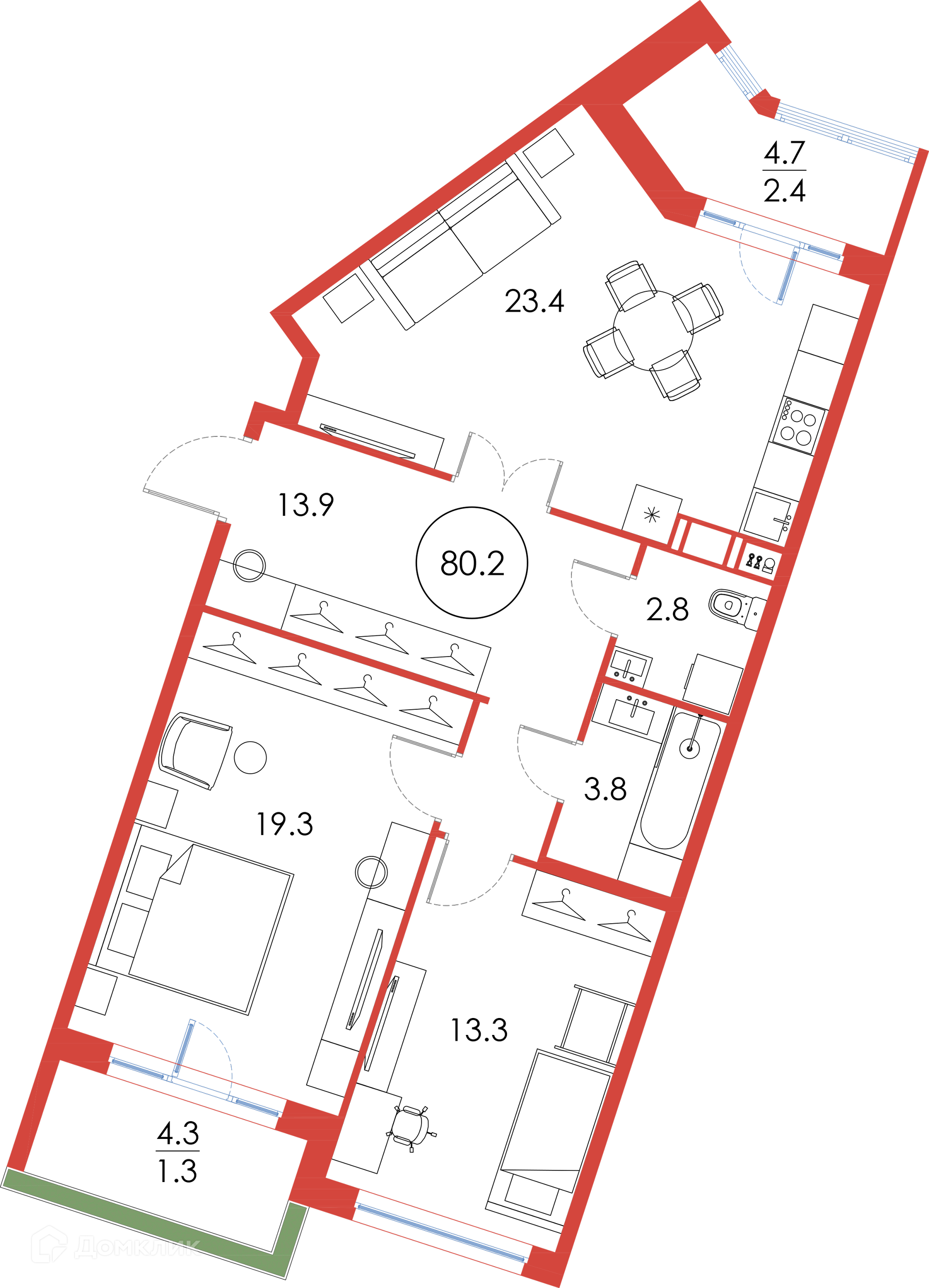 Общая площадь 80.2 м2