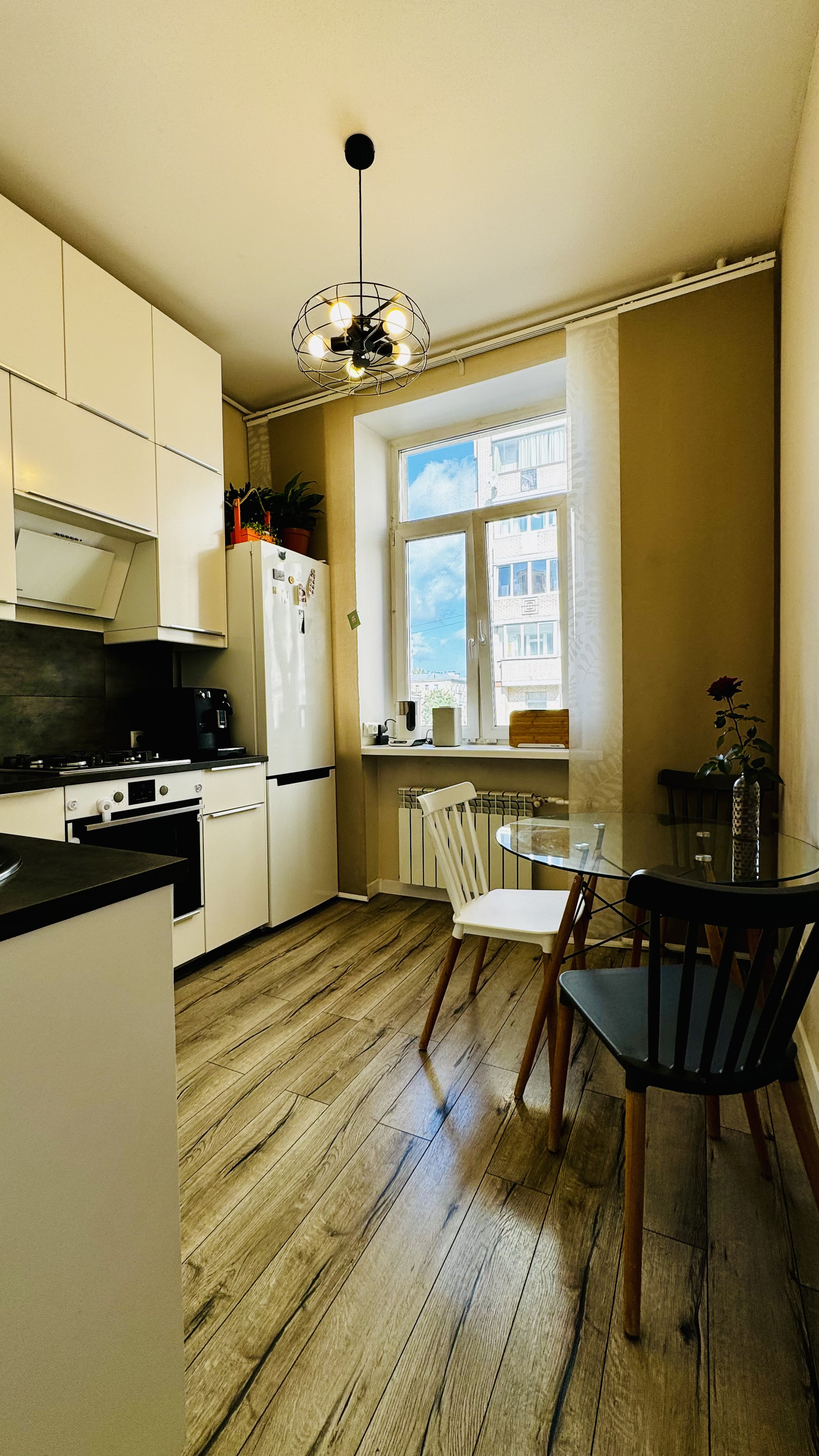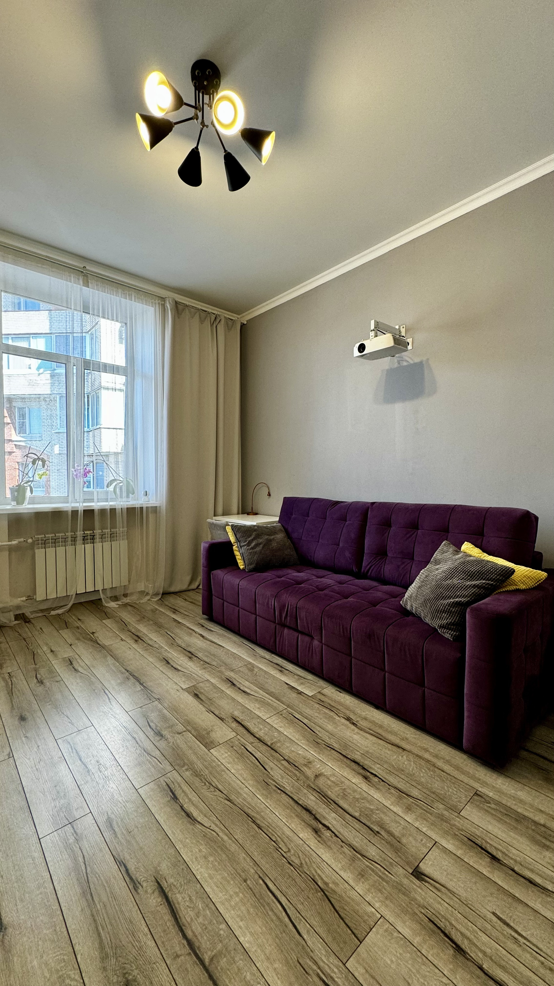 Окна комнаты и кухни выходят в тихий переулок, а окна спальни в зеленый двор.