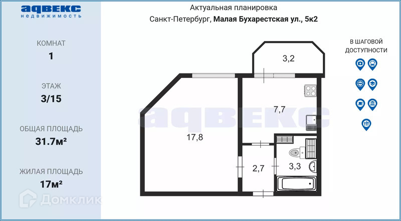 1-комнатная квартира, 31.7 м2, этаж 3 / 15, на продажу в Санкт-Петербурге, Малая Бухарестская улица, 5к2
