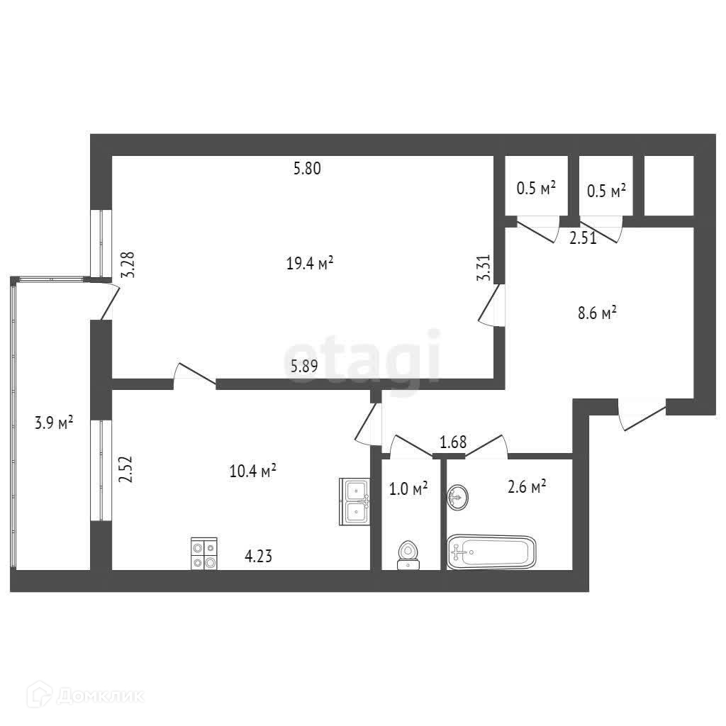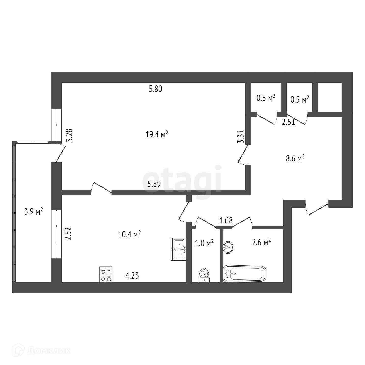 Жилая площадь 19.4 м2