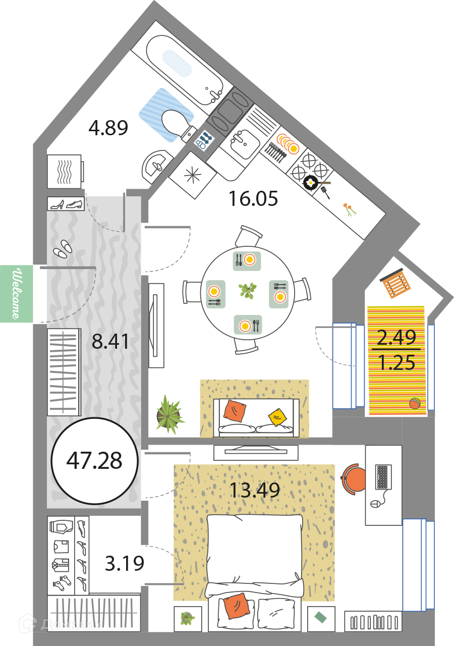 Общая площадь 47.28 м2