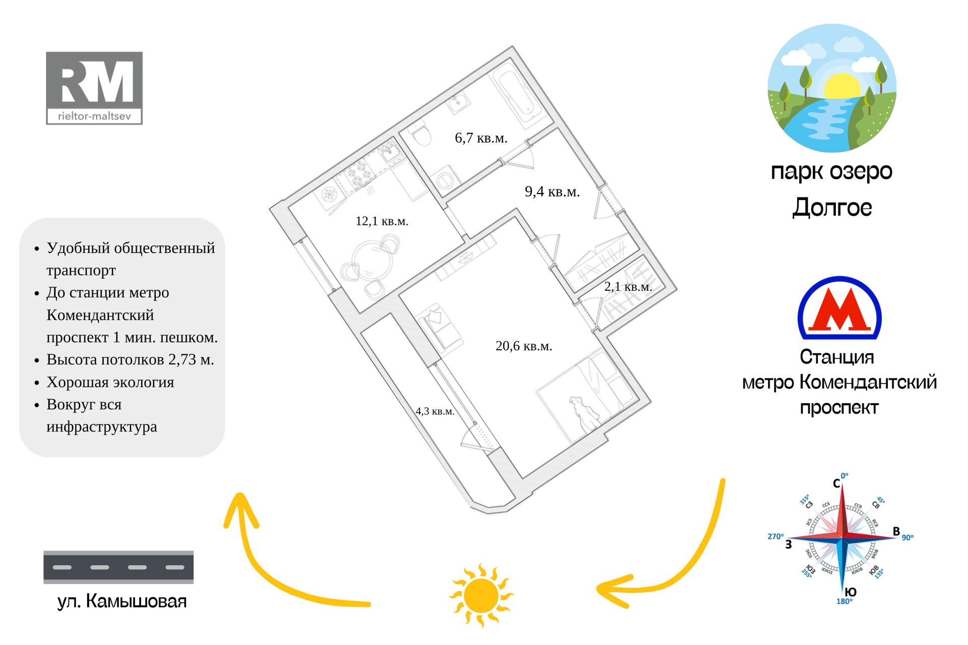 О расположении: Метро "Комендантский Проспект"" 1(одна) минута и Вы дома. Хорошая инфраструктура, школы дет.сады рядом. Всё в шаговой доступности. Безопасный экологически-чистый район. В непосредственной близости расположены парки и скверы, Юнтоловский заказник, Лахтинский разлив, парк 300 летия, Лахта центр и т.д.