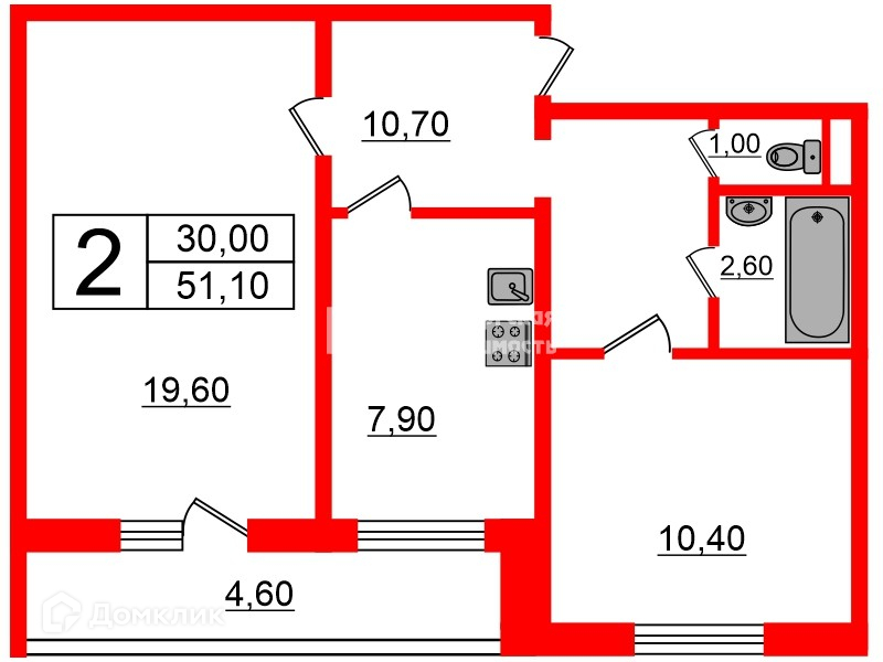 Общая площадь 51.1 м2