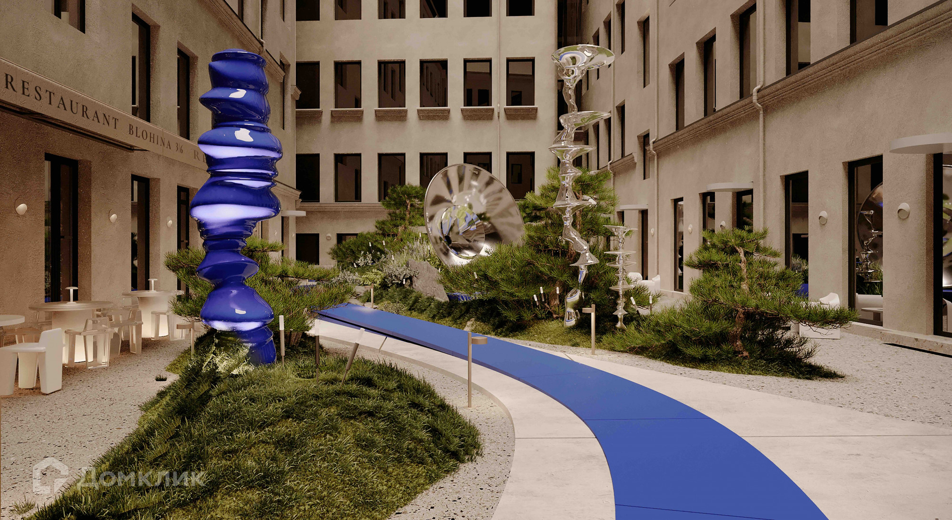 Особое внимание в Project 6/3 было уделено двору дома, в проекте которого - ландшафтный дизайн, озеленение взрослыми деревьями, фонтан, арт-инсталляции, зоны для отдыха и прогулок.