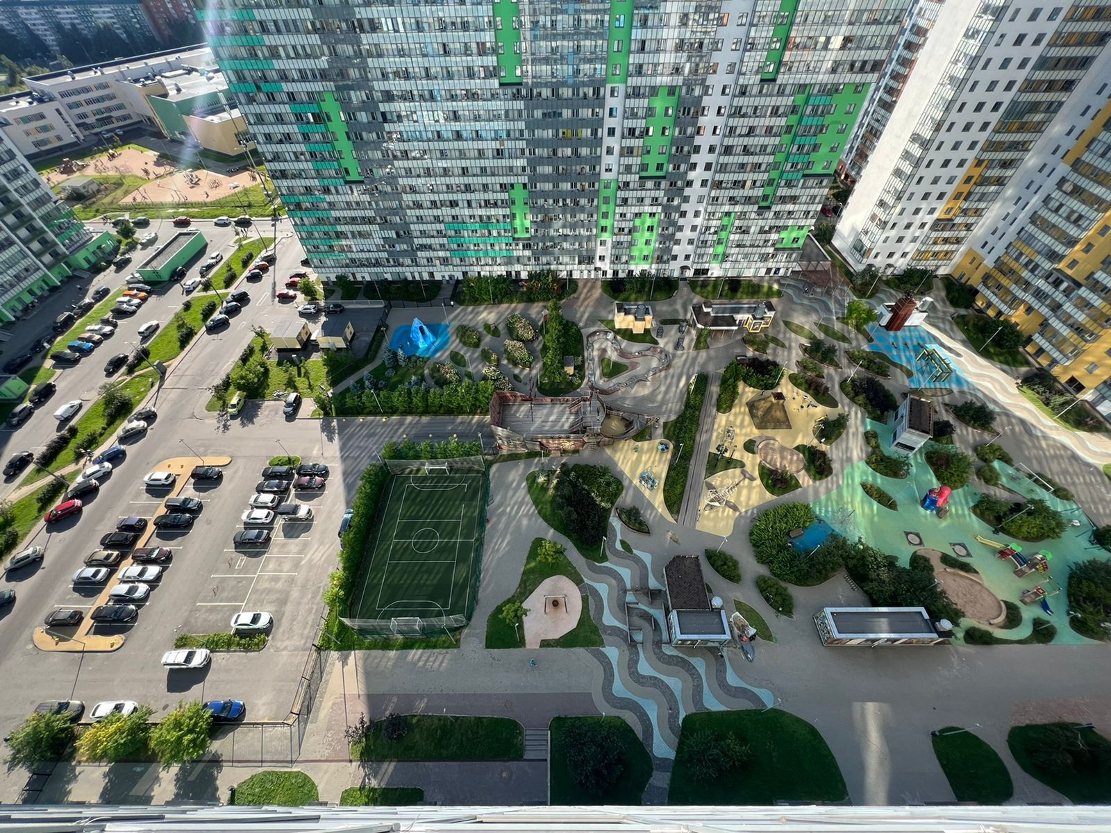 Детские игровые и спортивные площадки построены из ударопоглащающих, безопасных покрытий.