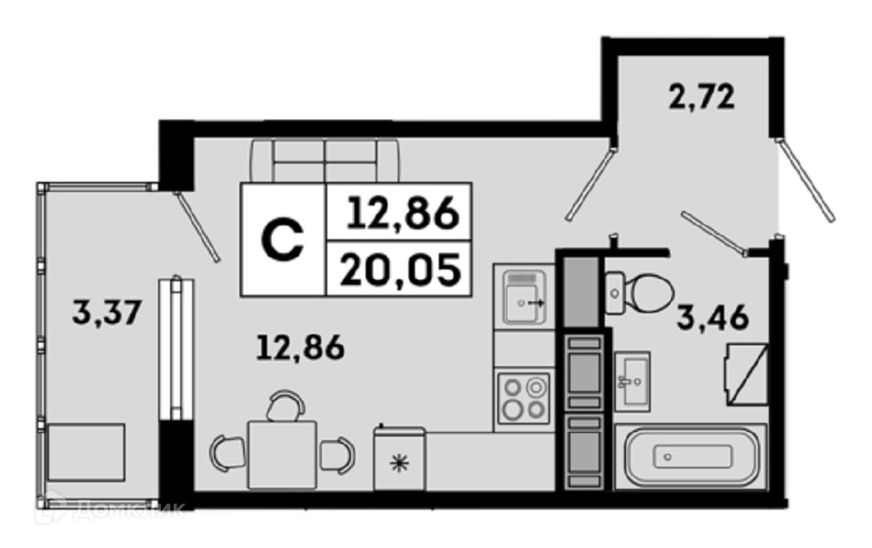№333351 Студия в ЖК `ОКЛА` общей площадью 20,05 м2, жилая площадь 12.86 м2, холл 2,72 м2, туалет 3,46 м2, балкон 3,37 м2,  на 5 этаже 7-ми этажного дома. Без отделки. Договор ДДУ.