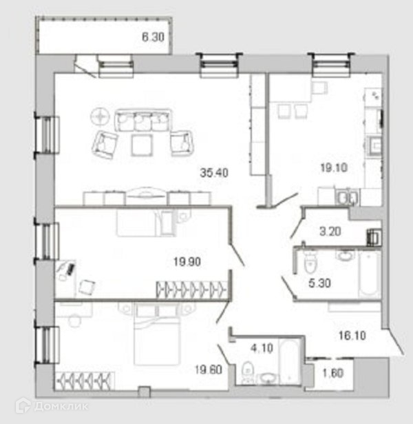 Выверенное планировочное решение квартиры предполагает комфортную кухню общей площадью 19,1 кв.м., 2 изолированные спальни почти по 20 м.кв. и просторную гостинную 35 м.кв. с выходом на балкон. 2 санузла, достаточное количество мест для хранения вещей (2 вместительных гардероба в прихожей и коридоре).
