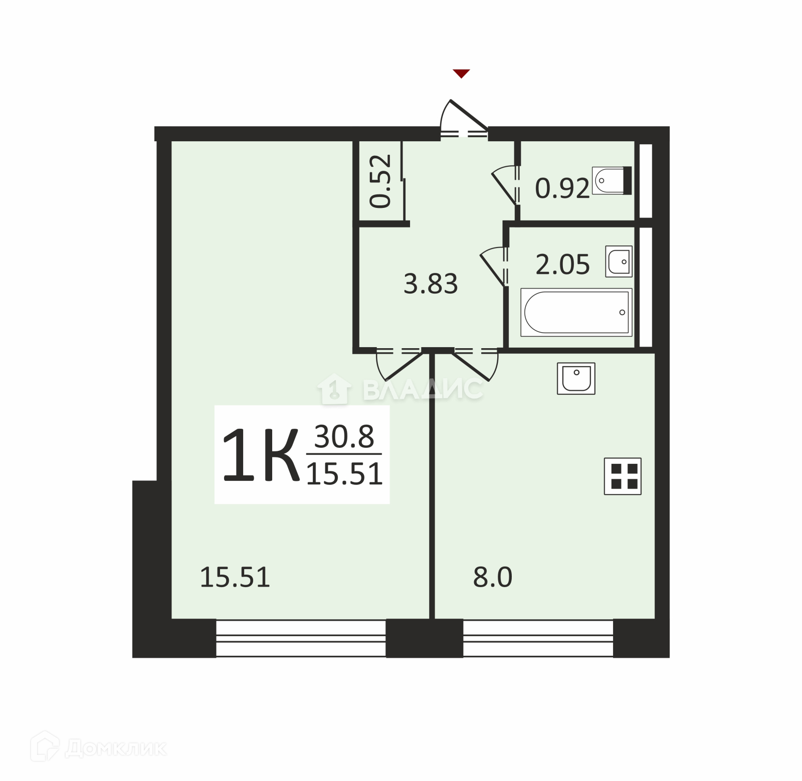 Общая площадь 30.8 м2