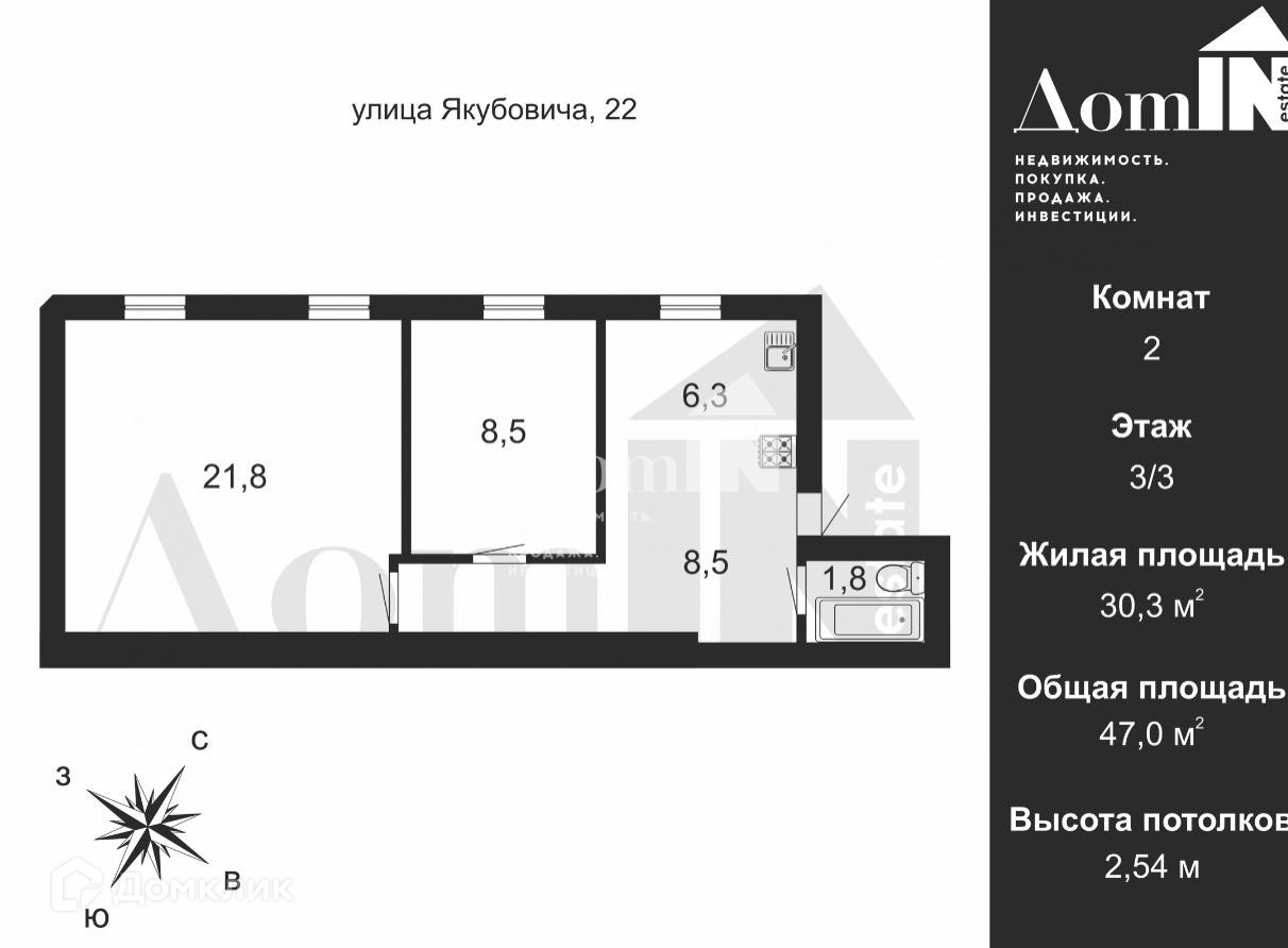 2-комнатная квартира, 47 м2, этаж 3 / 3, на продажу в Санкт-Петербурге, улица Якубовича, 22