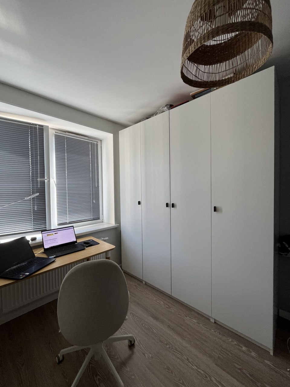На полу — ламинат от застройщика в отличном состоянии, стены окрашены в белый (обои под покраску, можно легко изменить цвет под ваш вкус).