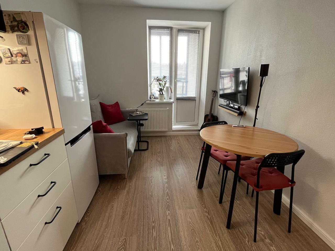 Кухня-гостиная площадью 13 м² удобной формы, в которой легко разместить всё необходимое для жизни. Встроенный кухонный гарнитур IКЕА с дорогой фурнитурой ВLUМ, посудомоечная машина Еlесtrоluх, варочная поверхность, духовой шкаф и микроволновая печь IКЕА — всё это останется вам в отличном состоянии.