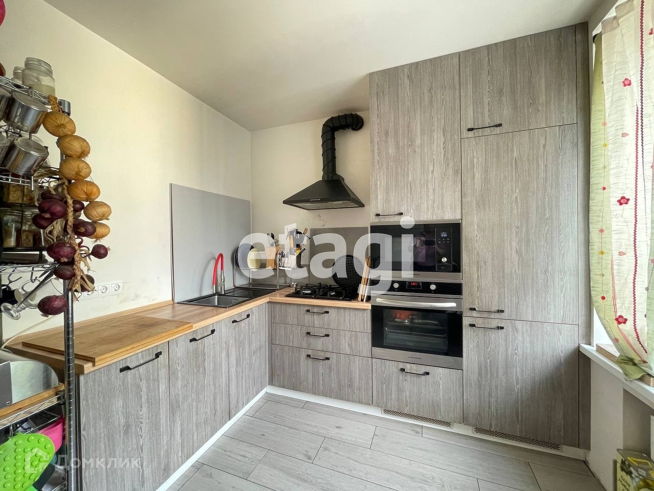 Квартира продается с кухонным гарнитуром и техникой.