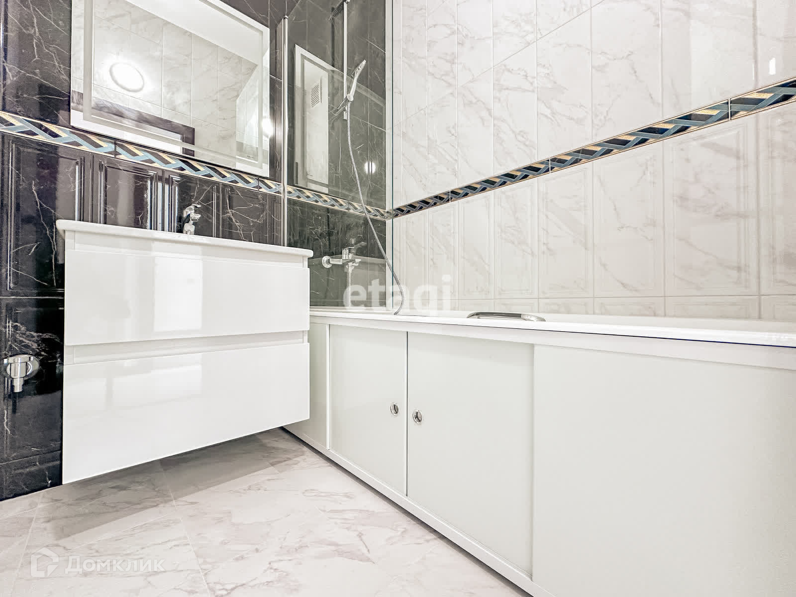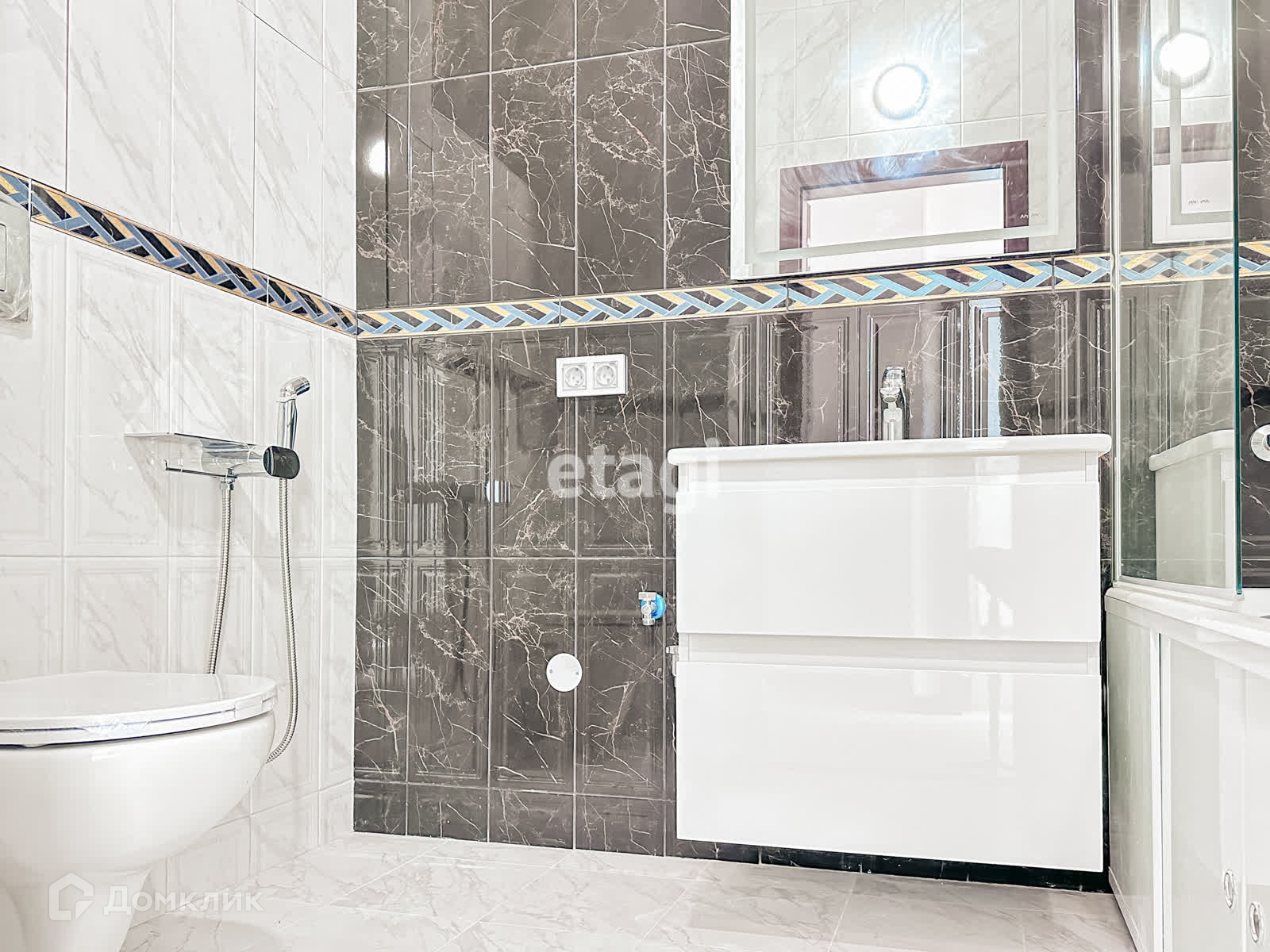 • Стены в санузлае отделаны плиткой под«натуральный» светлый и темный мрамор