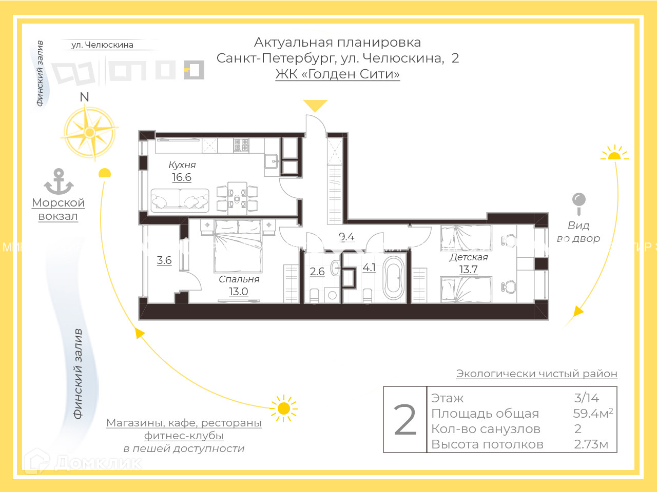2-комнатная квартира, 59.4 м2, этаж 3 / 14, на продажу в Санкт-Петербурге, улица Челюскина, 2