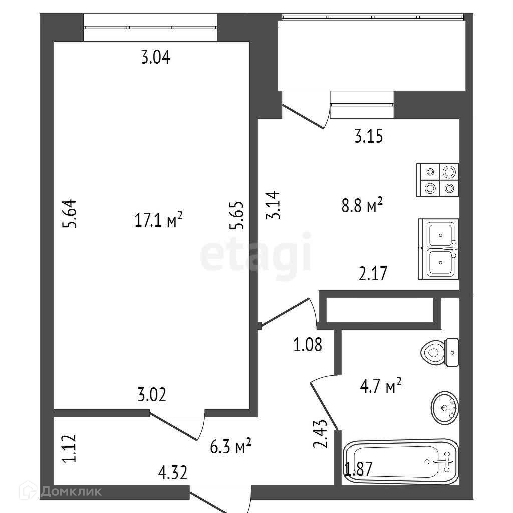 Жилая площадь 17.1 м2