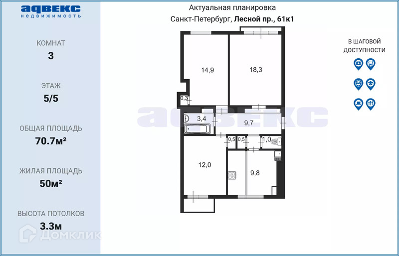 3-комнатная квартира, 70.7 м2, этаж 5 / 5, на продажу в Санкт-Петербурге, Лесной проспект, 61к1