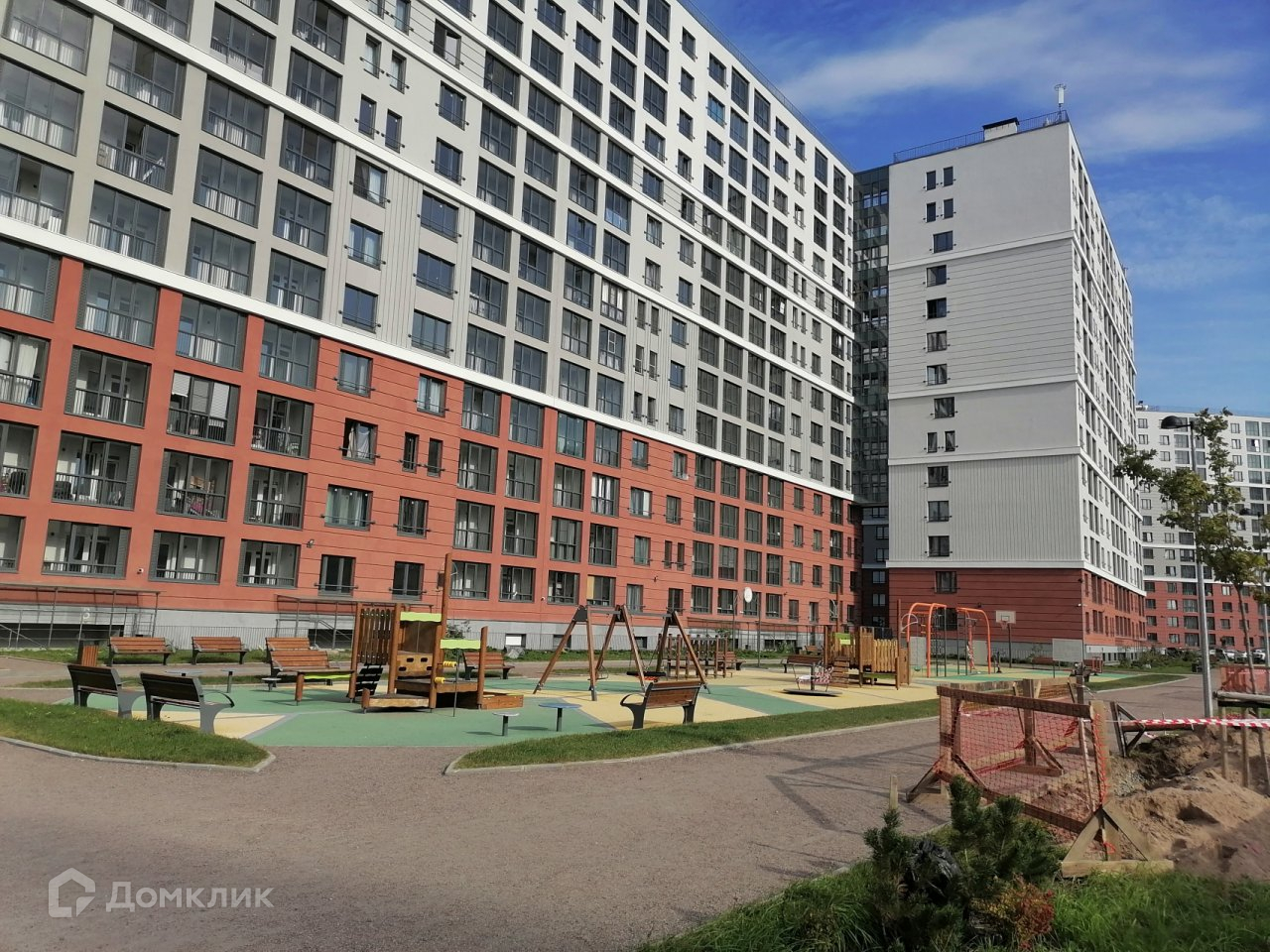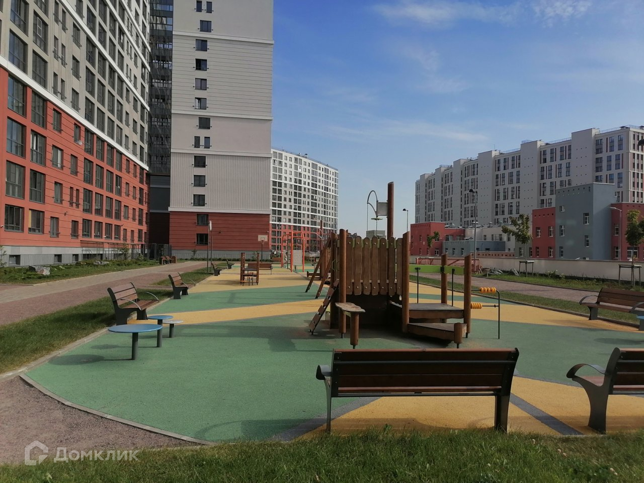 Во дворе установлены детские площадки, спортивные тренажеры и предусмотрены открытые парковочные места. Придомовая территория благоустроена зонами отдыха, деревьями и кустарниками.