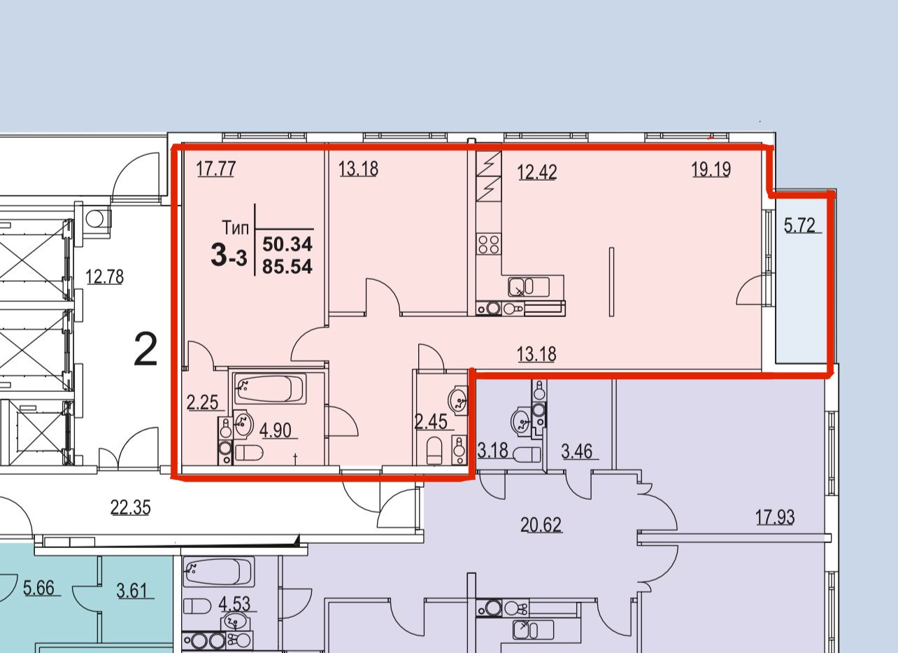 Удобная планировка с просторной кухней-гостиной более 30м2., комнаты 18м2 и 13м2, + гардеробная 3м2. Санузел раздельный.