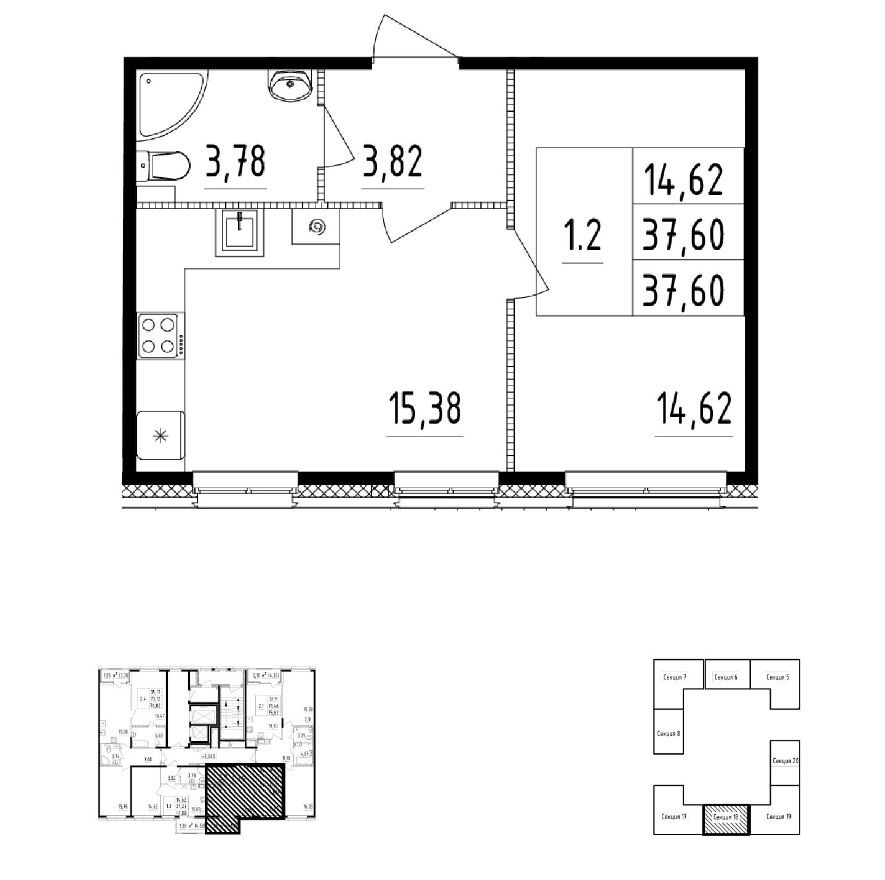 Площадь кухни 15.38 м2