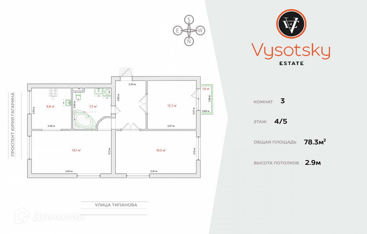 3-комнатная квартира, 78.3 м2, этаж 4 / 5, на продажу в Санкт-Петербурге, улица Типанова, 14