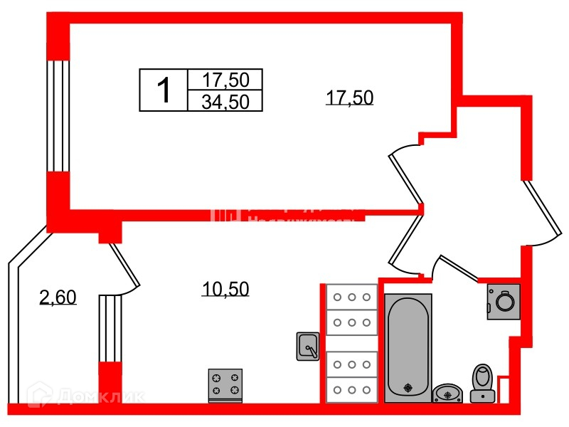 Общая площадь 34.5 м2