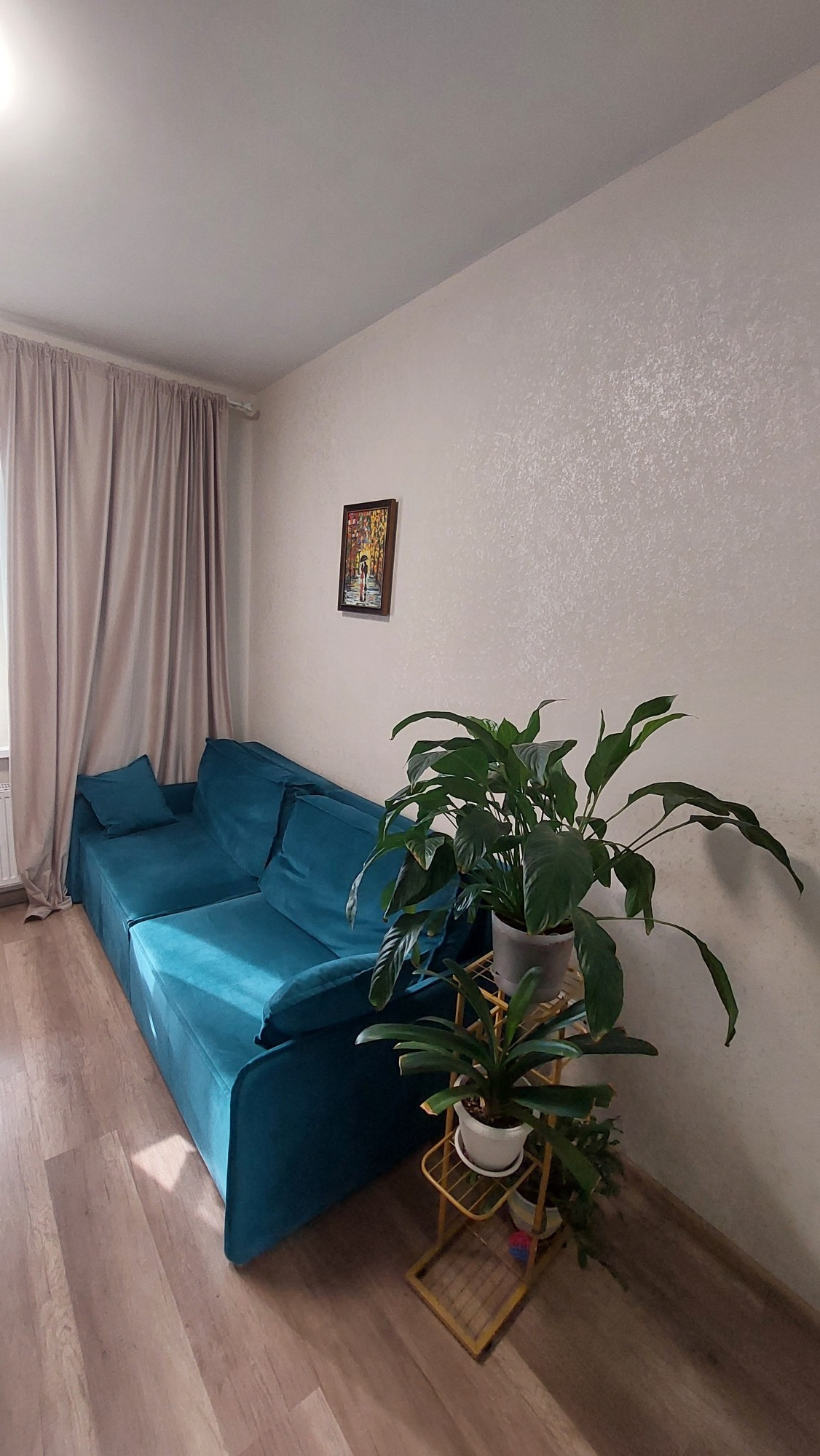 Стены - декоративная штукатурка, пол - качественный ламинат, кафельная плитка, ванная - кафель, большая утеплённая лоджия 5 кв.м., панорамные окна ПВХ, нижнее стекло укрепленное.
