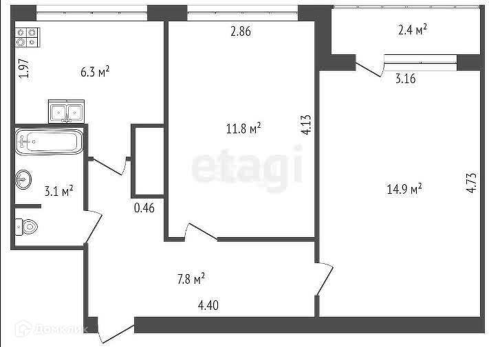 Общая площадь 43.9 м2