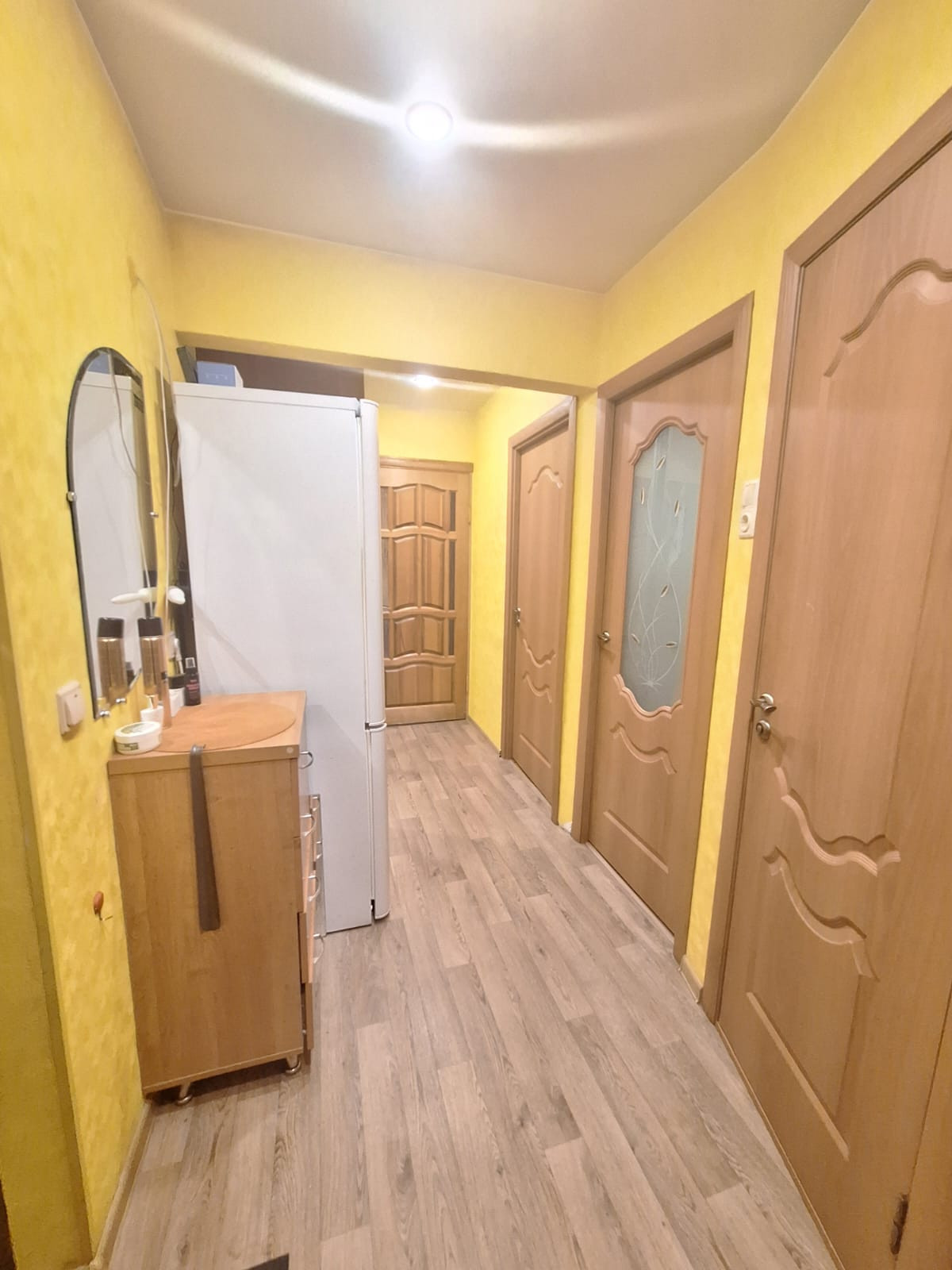 Комнаты: изолированная  9,9 кв.м и смежные 17,4 и 10,1 кв.м. Светлая кухня 7,1 кв.м. Санузел раздельный, ванна в кафеле. Широкий коридор 6,6 кв.м, установлен вместительный шкаф-купе. Есть кладовка и застекленный балкон.