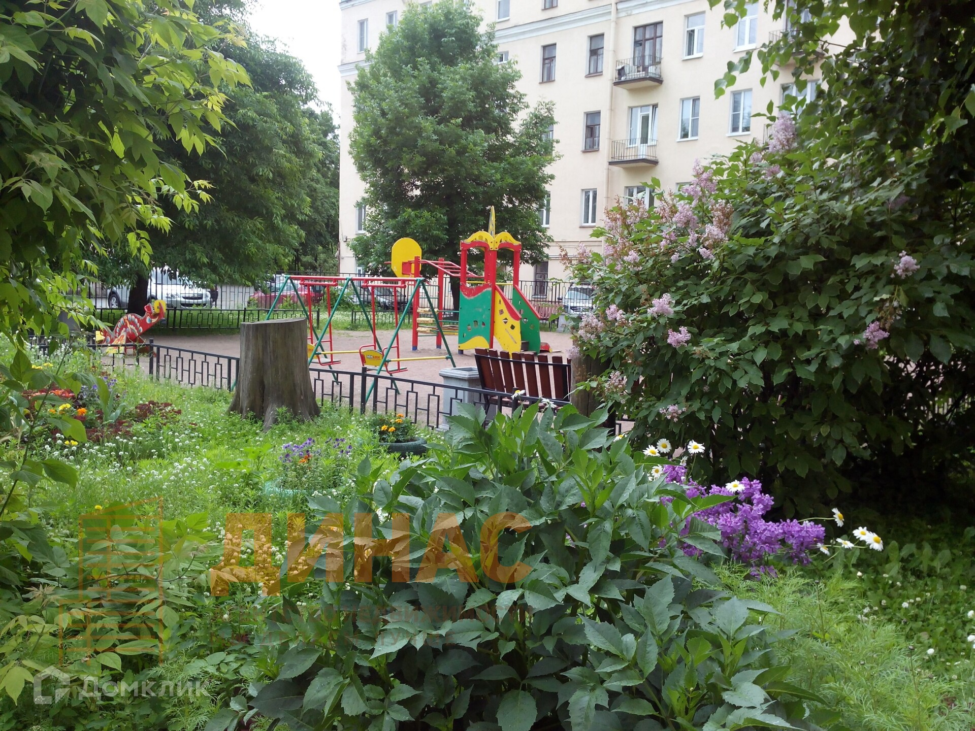 Ухоженный зелëный двор с детской площадкой и возможностью парковки автомобиля.