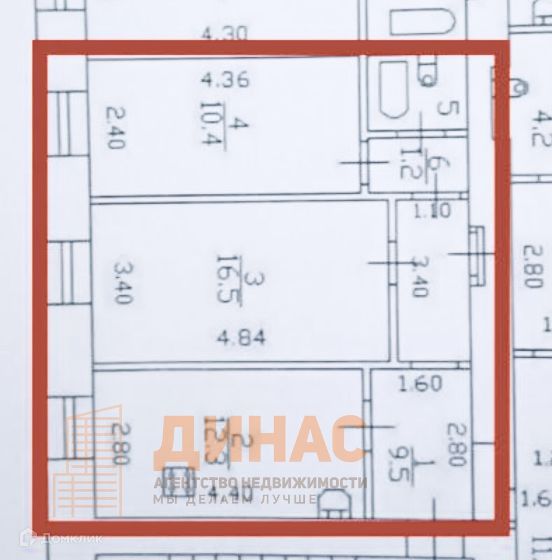 Общая площадь 52,30 кв. м., раздельные комнаты площадью 16,50 и 10, 40 кв. м., большой коридор.