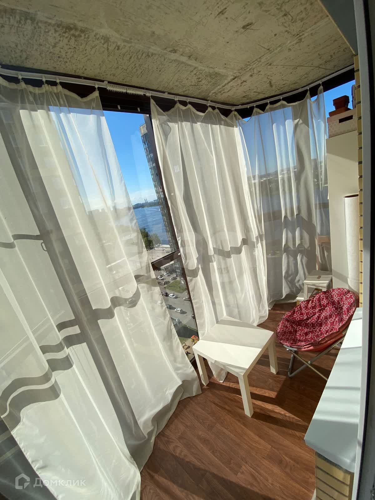 Балкон с панорамным остеклением, волшебным видом на Неву и вантовый мост.