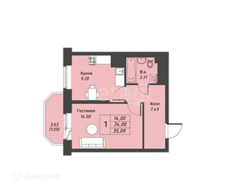 Общая площадь 34.7 м2