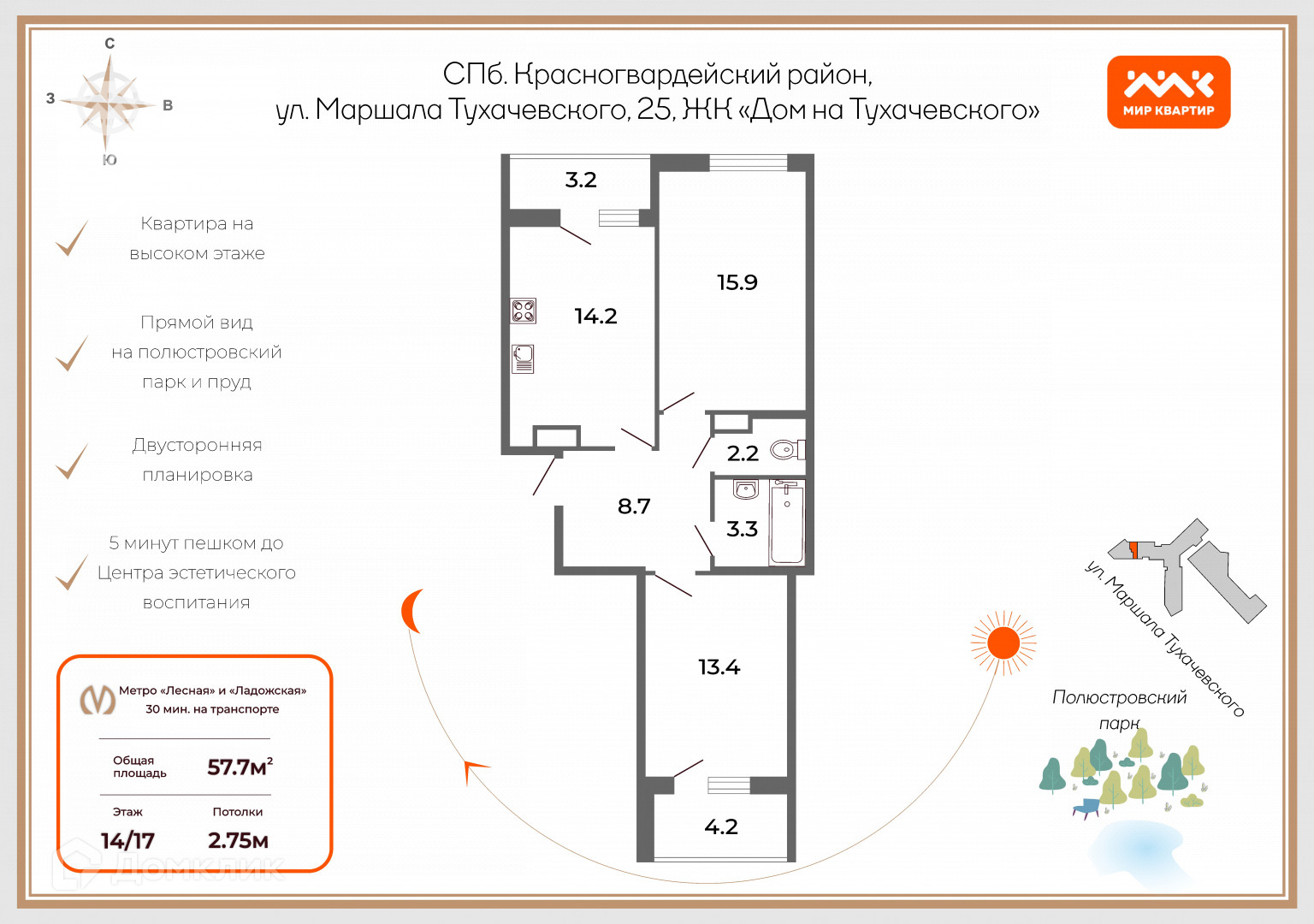 2-комнатная квартира, 57.5 м2, этаж 14 / 17, на продажу в Санкт-Петербурге, улица Маршала Тухачевского, 25