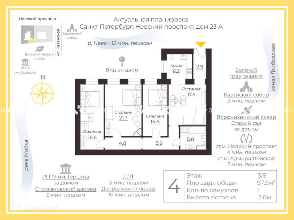 4-комнатная квартира, 97.5 м2, этаж 3 / 5, на продажу в Санкт-Петербурге, Невский проспект, 23
