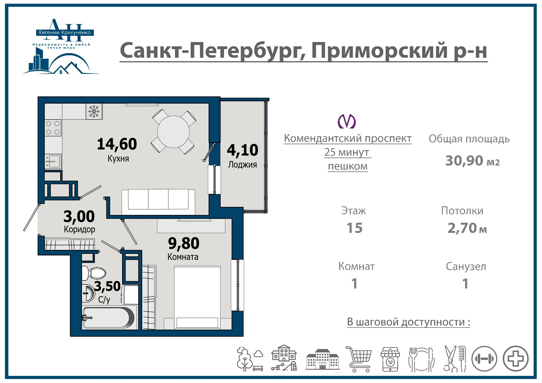 1-комнатная квартира, 30.9 м2, этаж 15 / 24, на продажу в Санкт-Петербурге, Арцеуловская аллея, 21