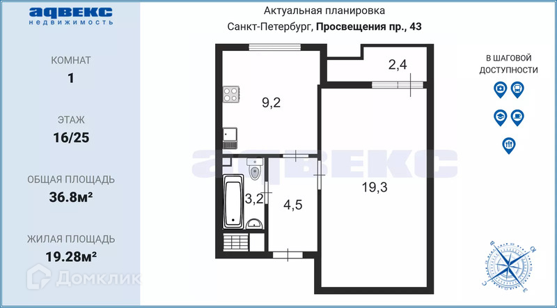 1-комнатная квартира, 36.8 м2, этаж 16 / 25, на продажу в Санкт-Петербурге, проспект Просвещения, 43