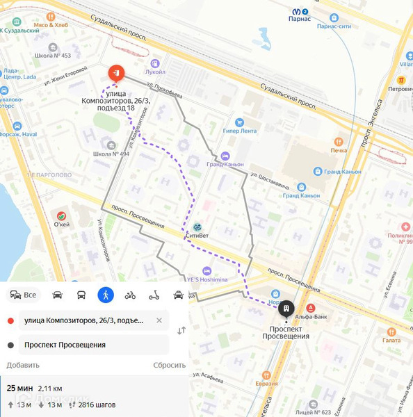 Дом расположен в 25 минутах ходьбы от м. Просвящения.