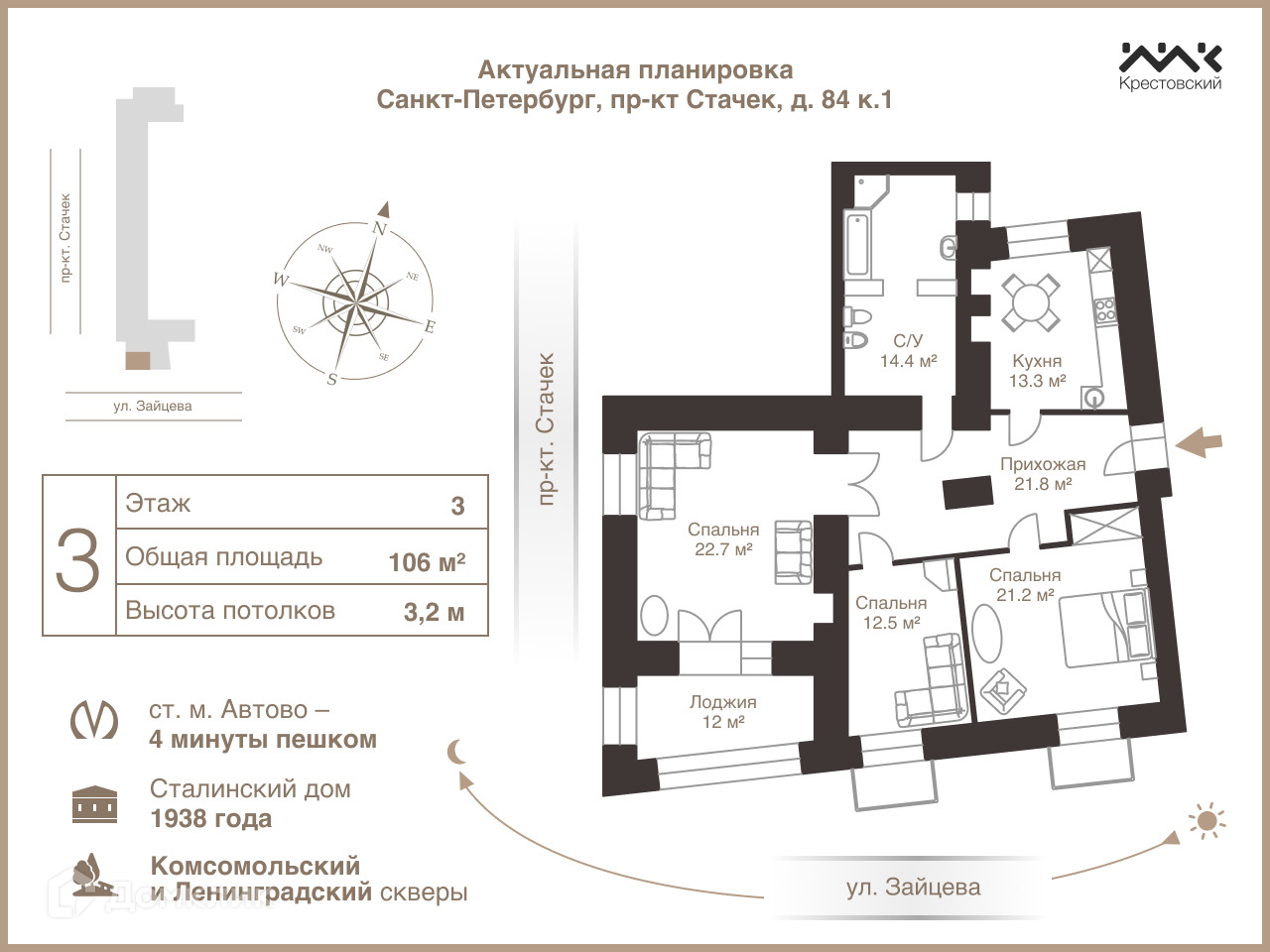 3-комнатная квартира, 105.9 м2, этаж 3 / 5, на продажу в Санкт-Петербурге, проспект Стачек, 84к1