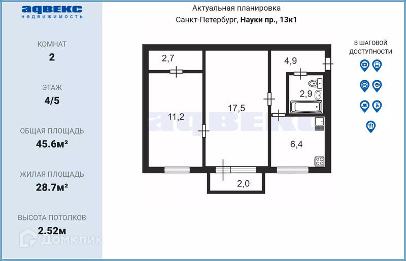 2-комнатная квартира, 45.6 м2, этаж 4 / 5, на продажу в Санкт-Петербурге, проспект Науки, 13к1
