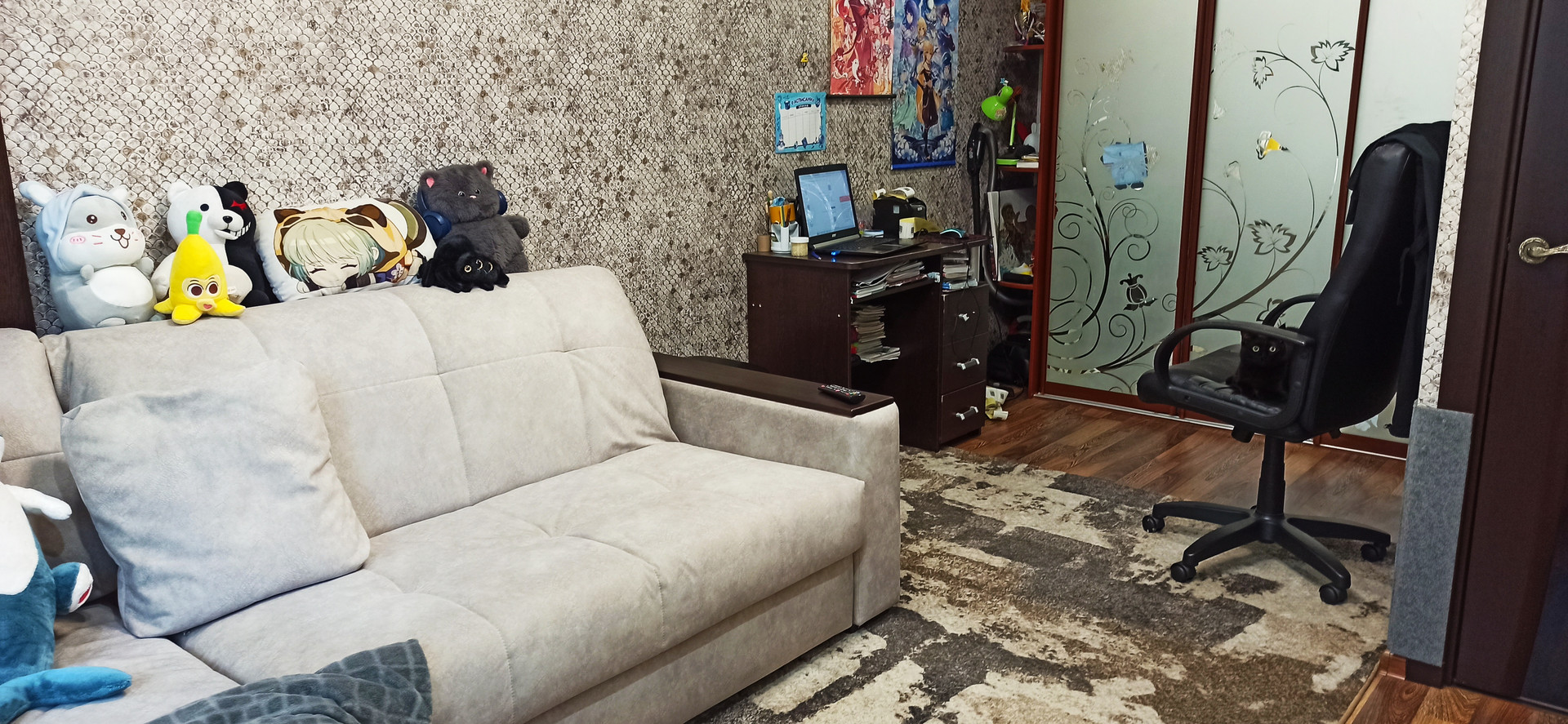 В квартире остается встроенная кухня со всей техникой, в т.ч. встроенный холодильник, посудомоечная машина, стиральная машина и вся мебель, кроме дивана в комнате.