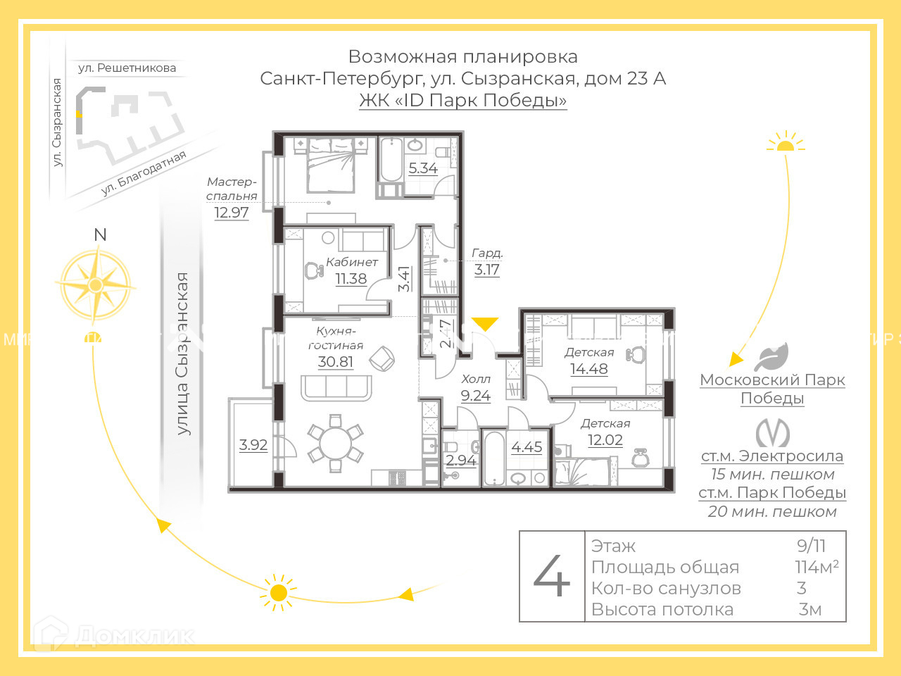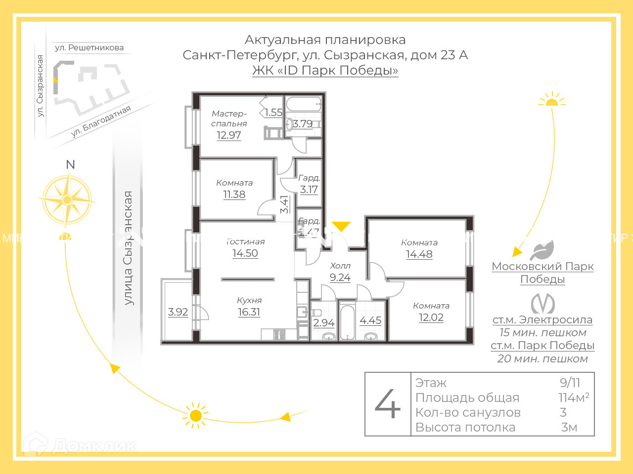 4-комнатная квартира, 114 м2, этаж 9 / 11, на продажу в Санкт-Петербурге, Благодатная улица, 50