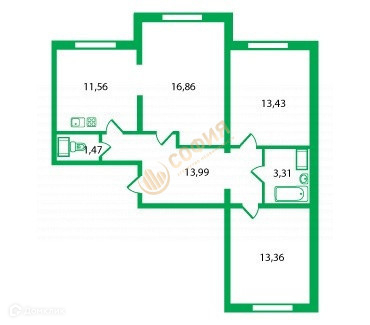 Общая пл. квартиры 73 кв.м., два санузла, две изолированные комнаты 13 кв.м + 13.50 кв.м., кухня-гостиная 28.50 кв.м (16.86 кв.м + 11.56 кв.м ), так же гостиную можно сделать изолированной, просторная прохожая 14 кв.м. Окна Северо –Восток и Юго –Запад.