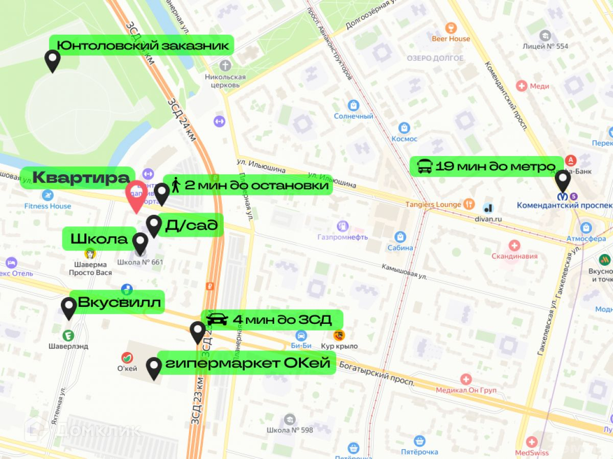 Транспортная доступность также на высшем уровне: в радиусе 3 километров расположено три станции метро — «Комендантский проспект», «Старая деревня» и «Беговая». Также рядом находятся многочисленные остановки наземного транспорта. Прямо у дома есть остановка автобуса, который за 19 минут довезёт вас до метро «Комендантский проспект».