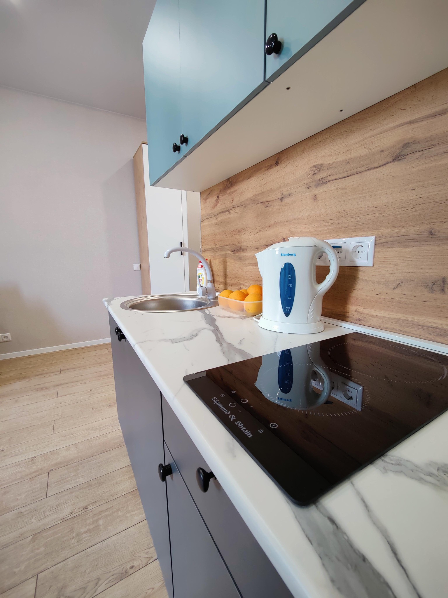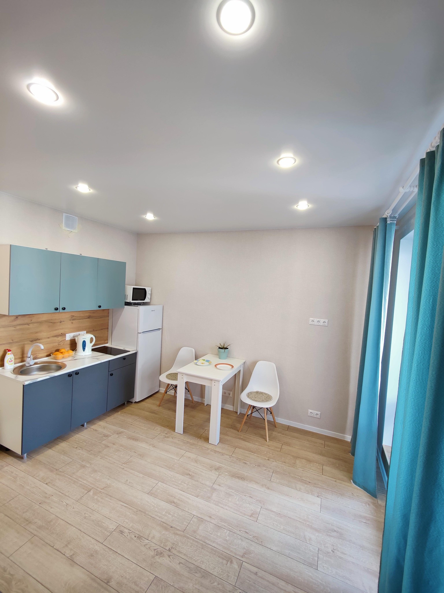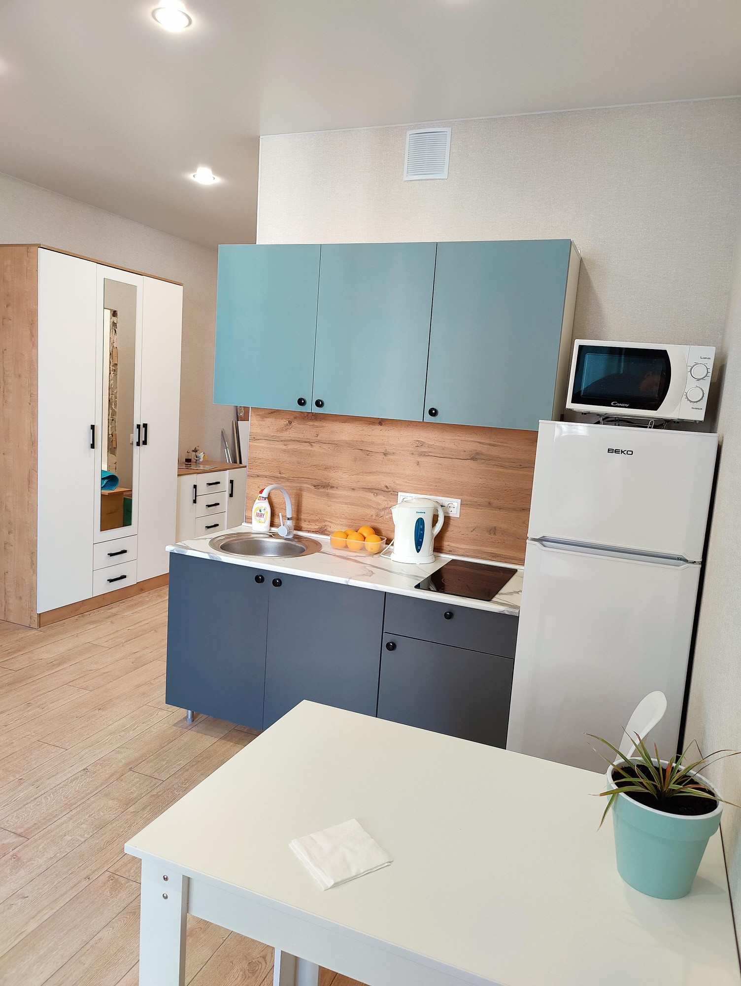 Из оснащения: Варочная поверхность, электрический чайник, холодильник, микроволновая печь, стиральная машина.