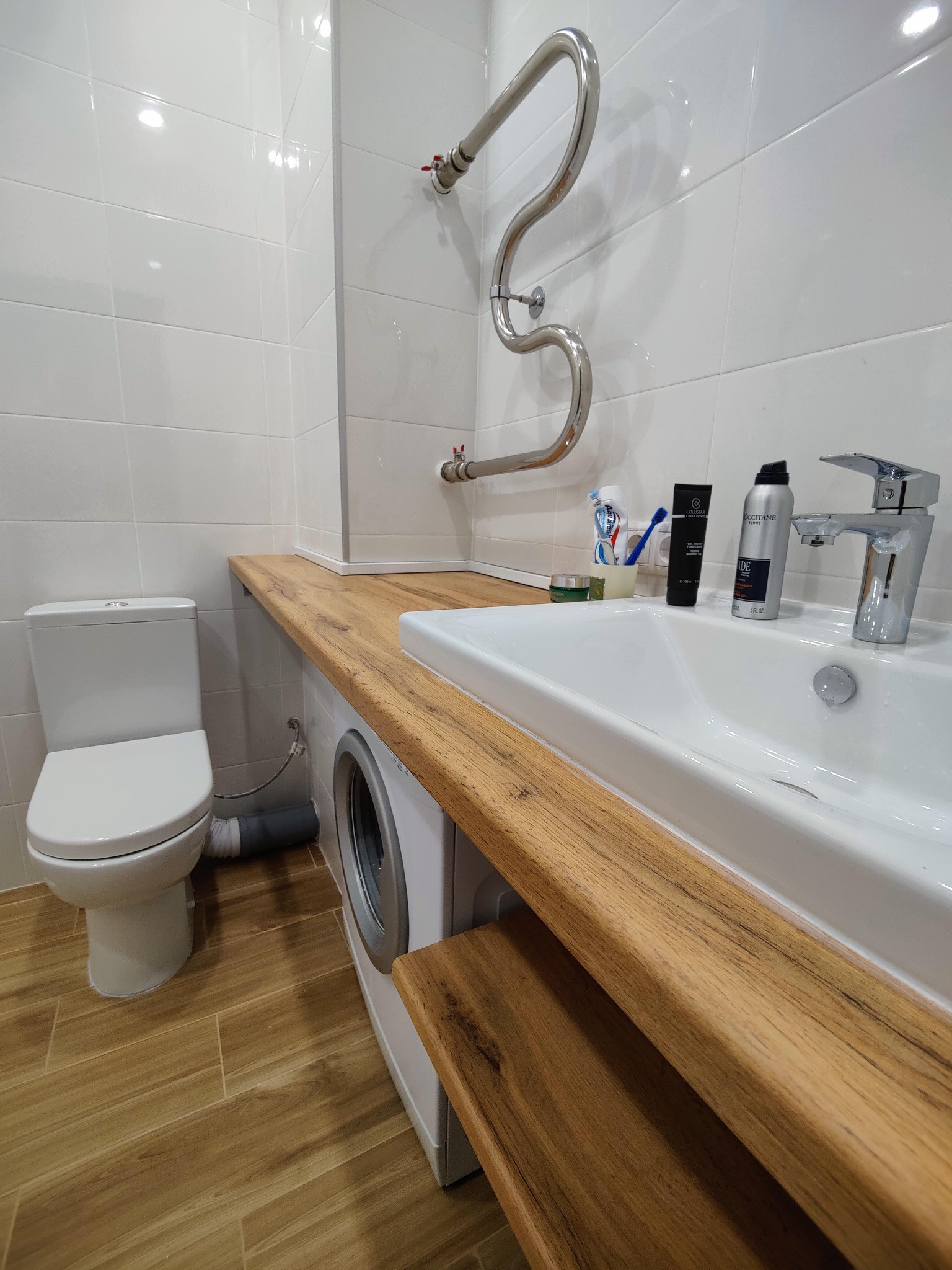 Просторная и светлая ванная комната в скандинавском стиле с массивной столешницей.