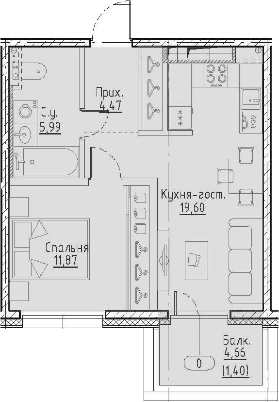 Общая площадь 43.33 м2